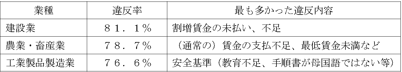 技能実習生を使用する事業場の73.2%で法令違反