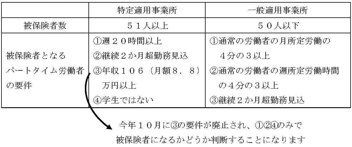 特定適用事業所におけるパートタイム労働者の社会保険加入要件について、「年収106万円(月額8.8万円)以上」の要件が2026年10月に撤廃され、収入ではなく労働時間による判断となる見込みです。
