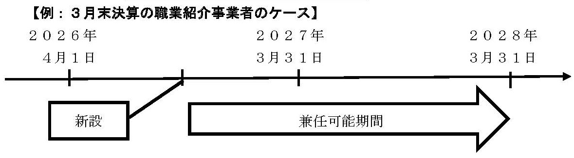既に許可を得て事業を実施している有料職業紹介事業者が、事業所を新設する際に、新設する事業年度の翌年度末までの間に限って兼任が可能となります。