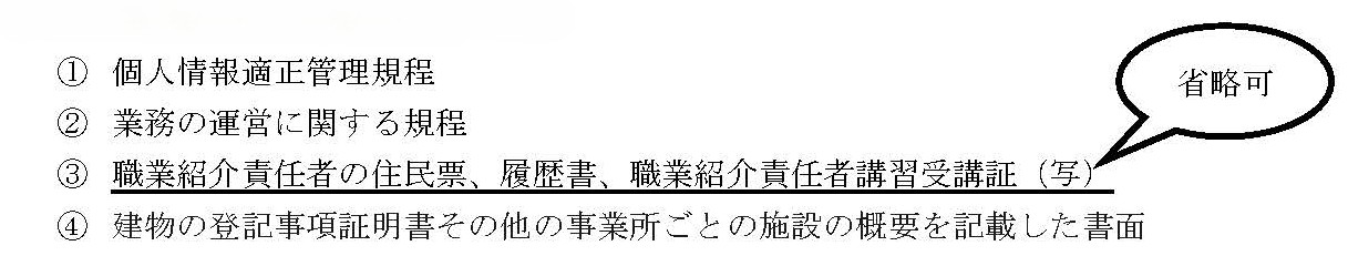 有料職業紹介事業所の新設にあたり、提出すべき書類は以下のとおりですが、兼任の場合は③を省略すること ができます。